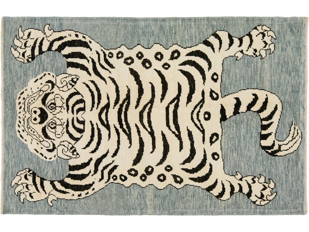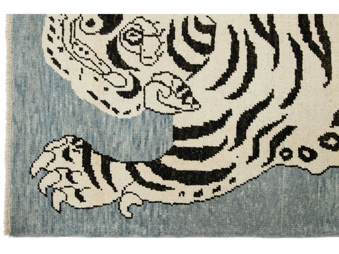 This beautiful Turkish Art Deco wool rug features a gray field with beige accent colors and a stunning tiger pictorial design. This rug measures 4'9" x 7'3".