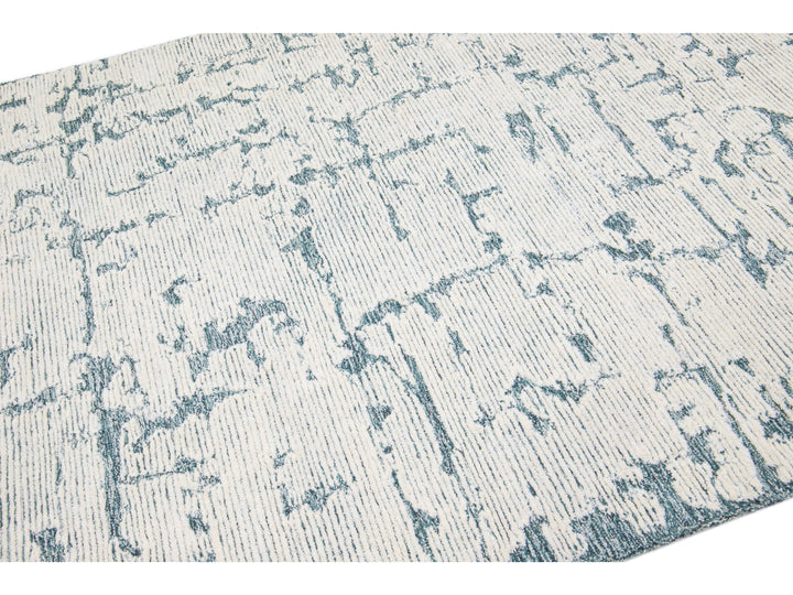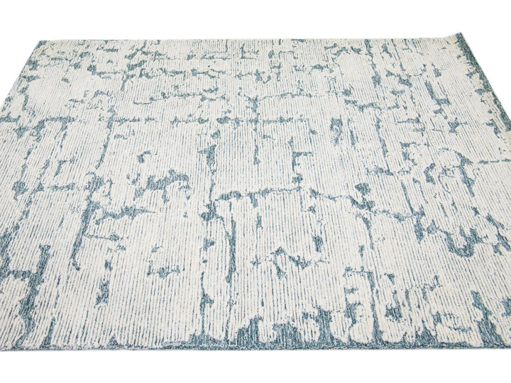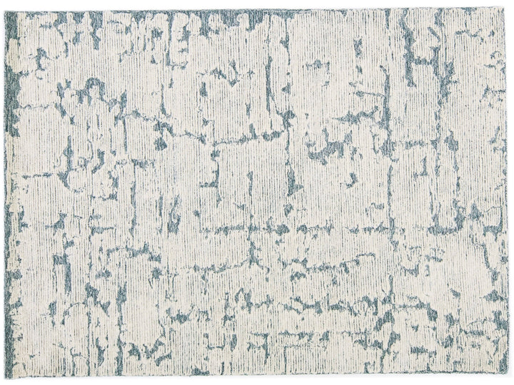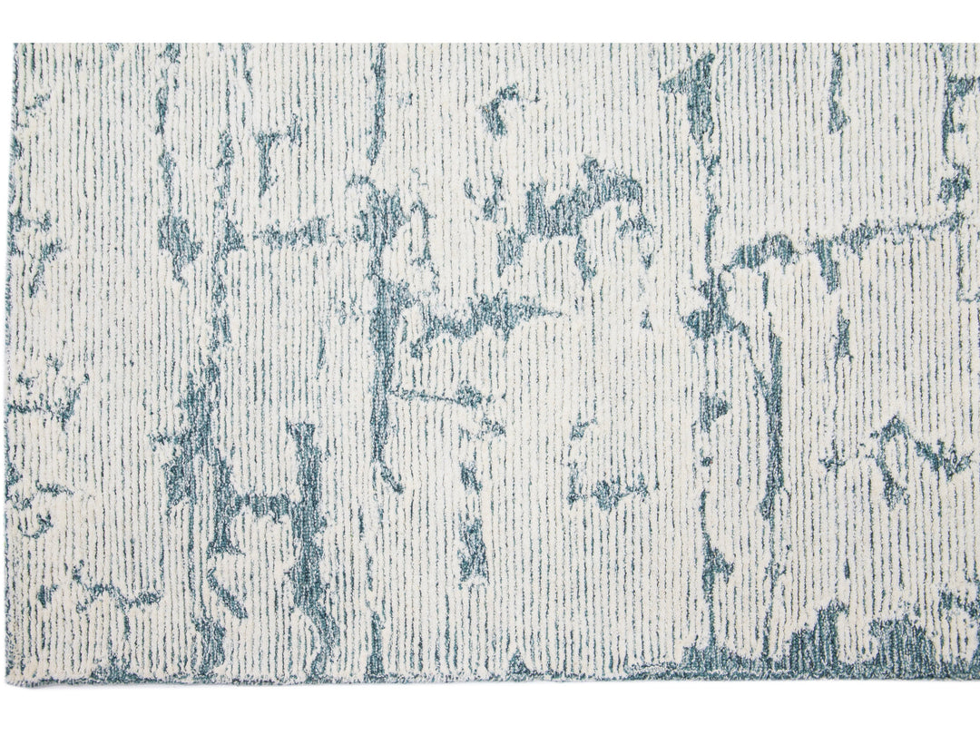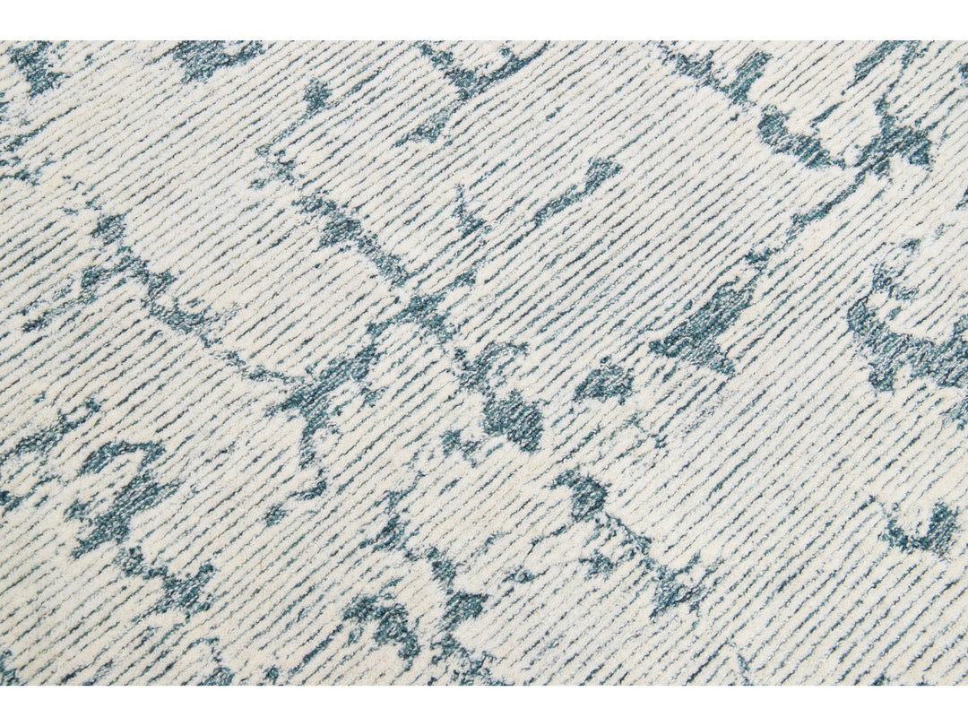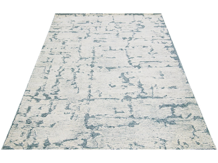 This Hand-Tufted wool rug is constructed with a Moroccan Style, showcasing a luxurious, modern, abstract minimalist texture with a subtle high-low pile design in ivory and blue tones.