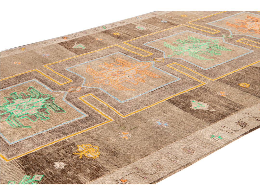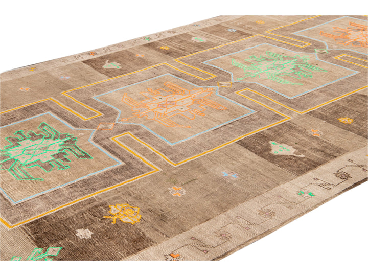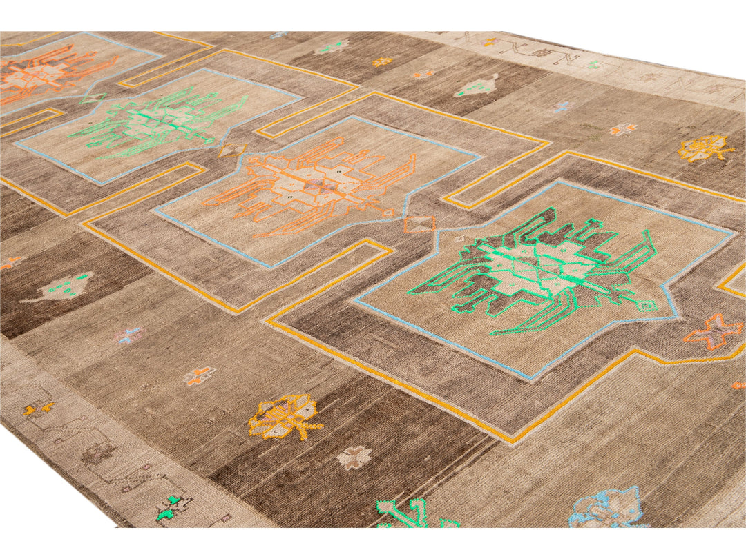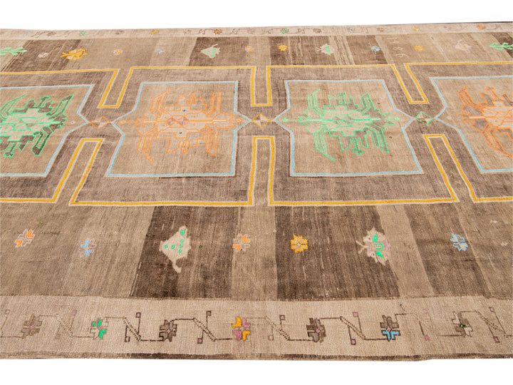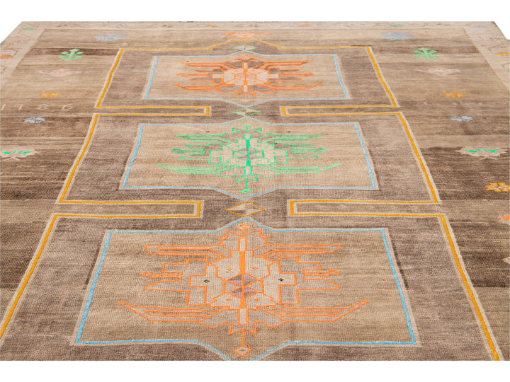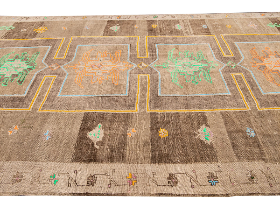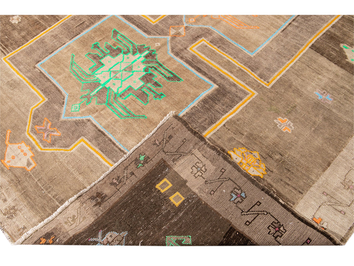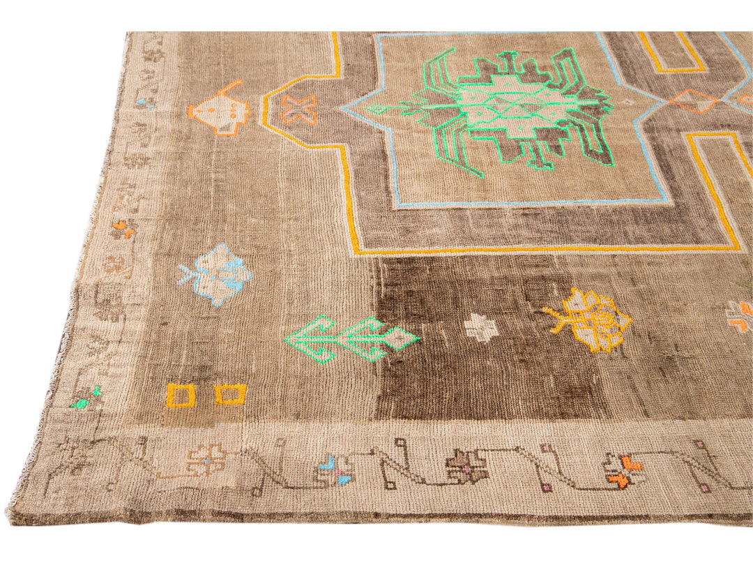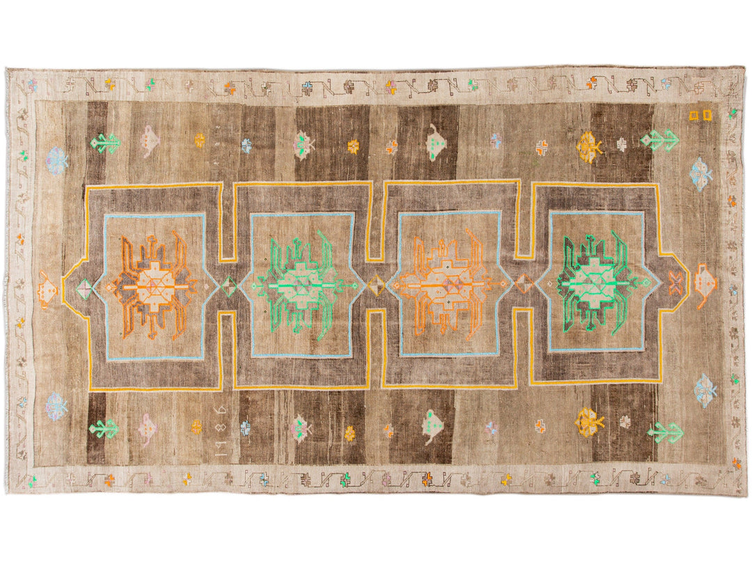 Beautiful vintage Turkish Kars hand-knotted wool rug with a beige and brown field. This Turkish rug has green, orange, blue, and yellow accents in a gorgeous all-over geometric Tribal design.
