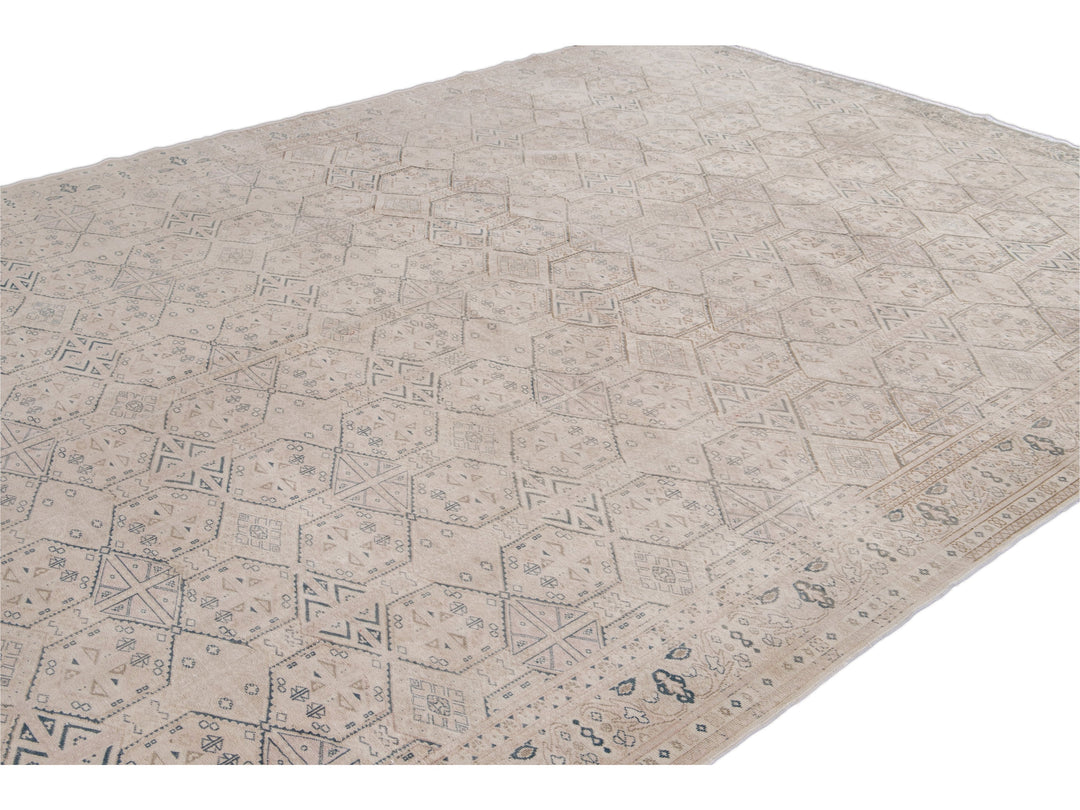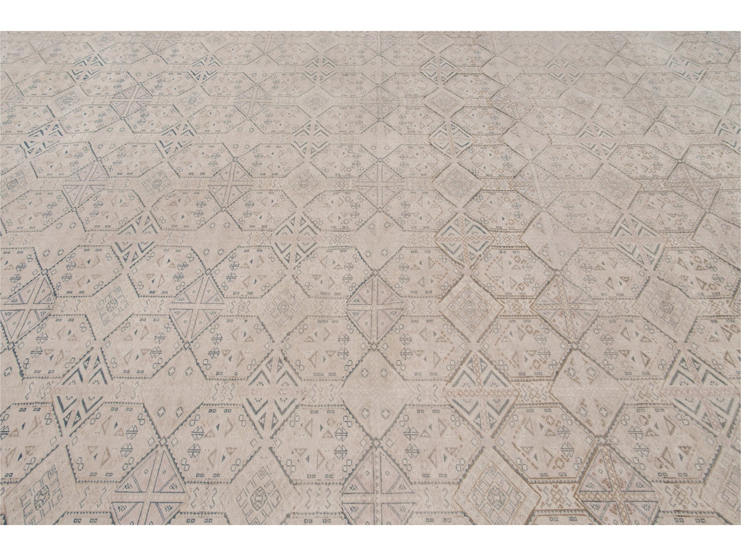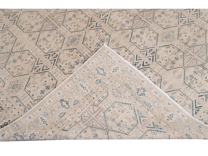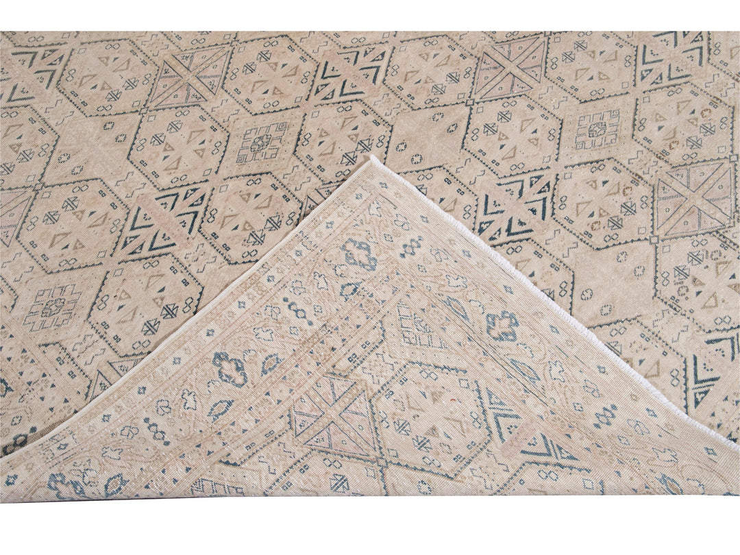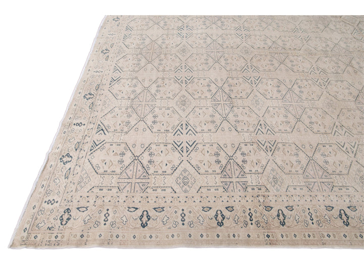 Beautiful vintage Turkish hand-knotted wool rug with a beige field. This Turkish rug has navy-blue, pink, and brown accents a gorgeous all-over geometric Pattern design.
