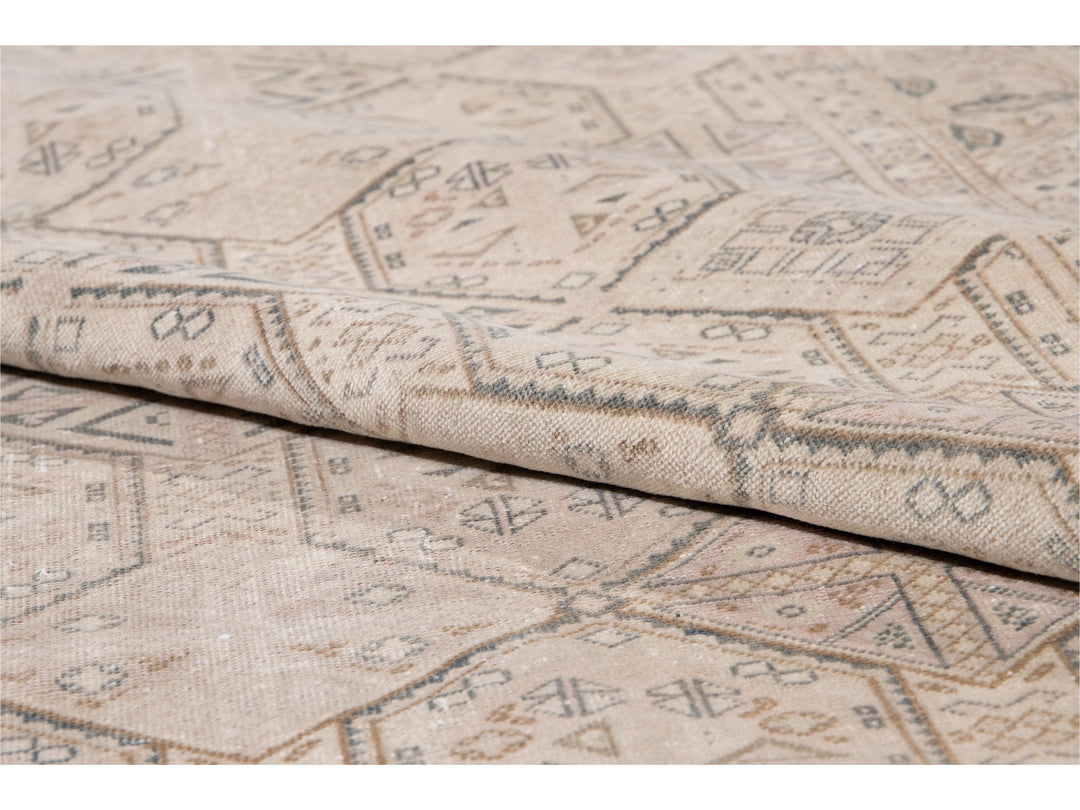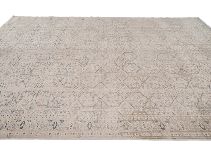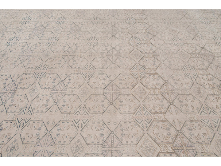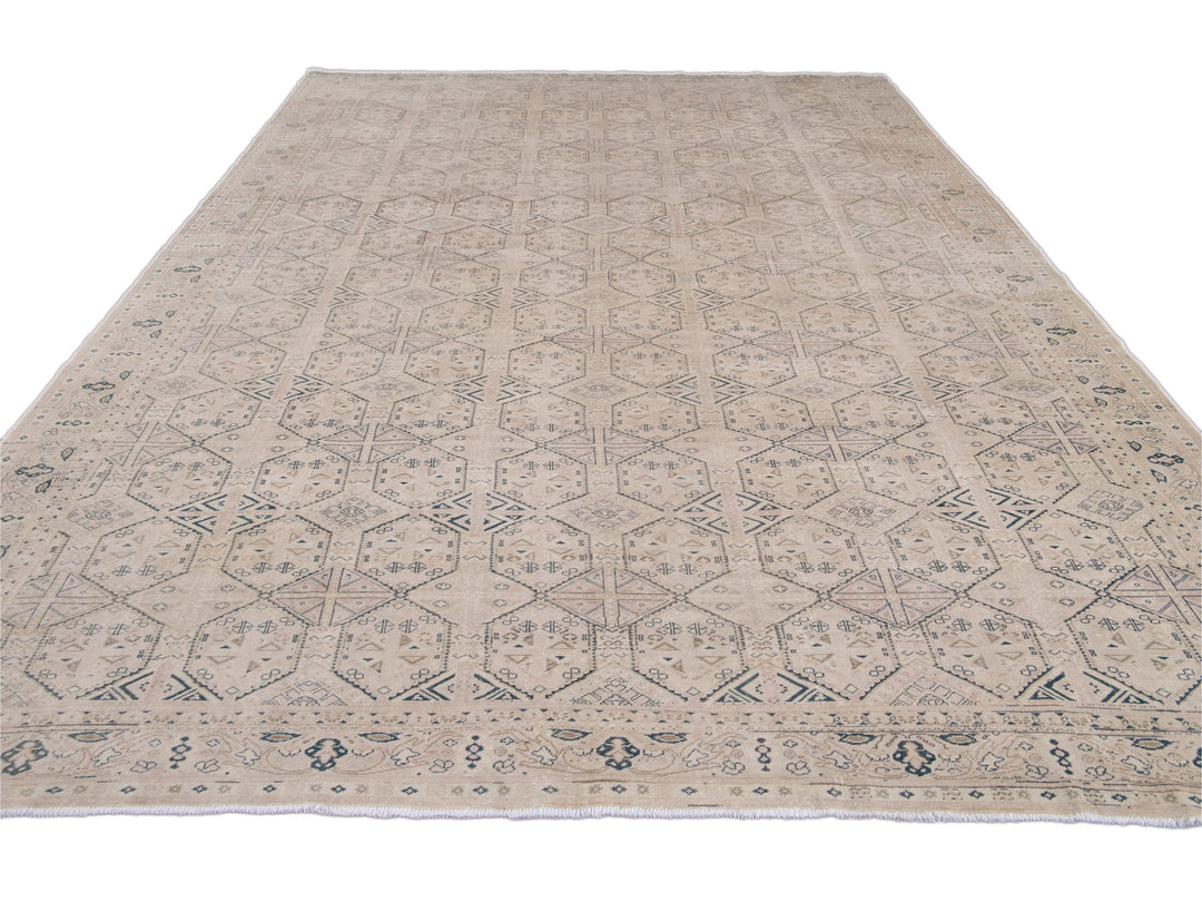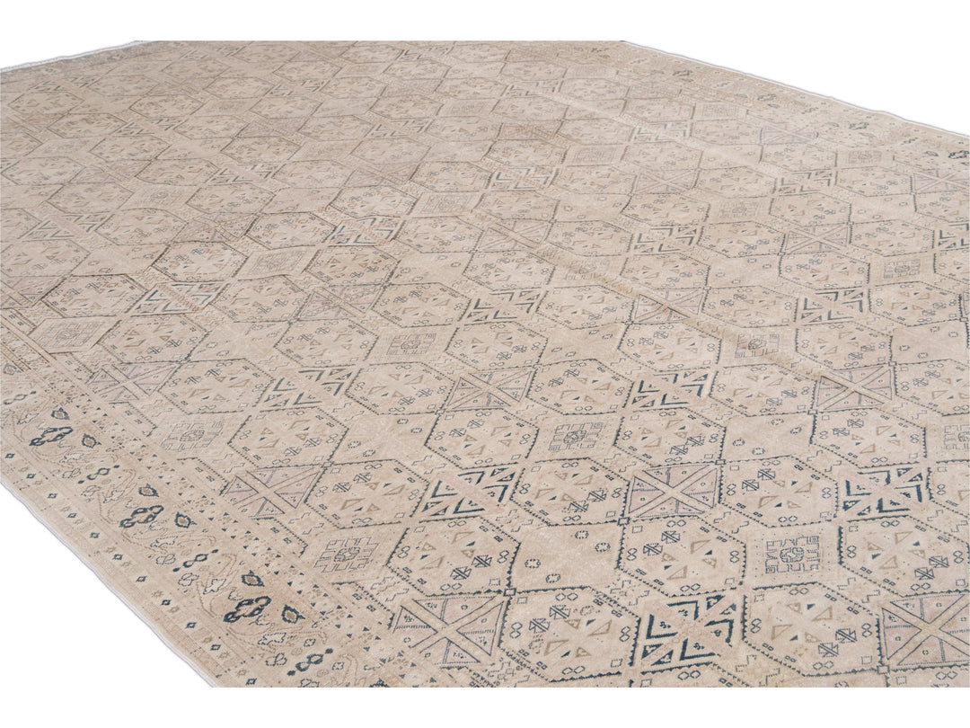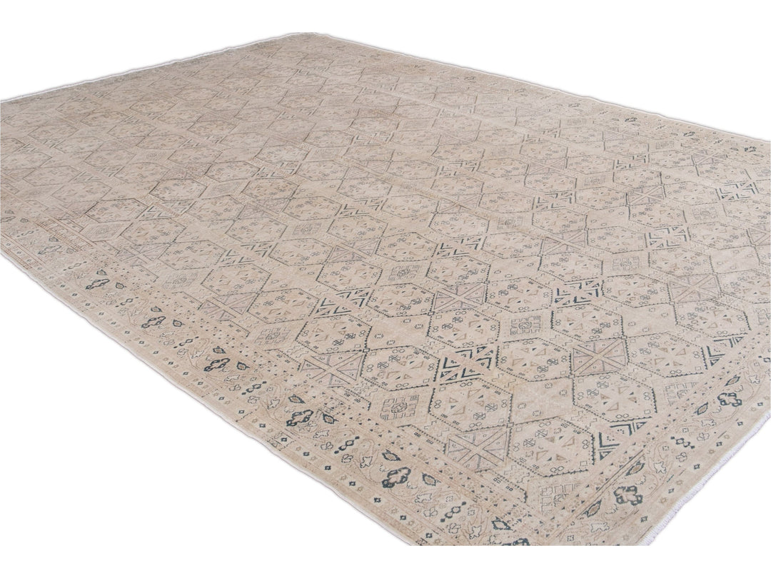 Beautiful vintage Turkish hand-knotted wool rug with a beige field. This Turkish rug has navy-blue, pink, and brown accents a gorgeous all-over geometric Pattern design.